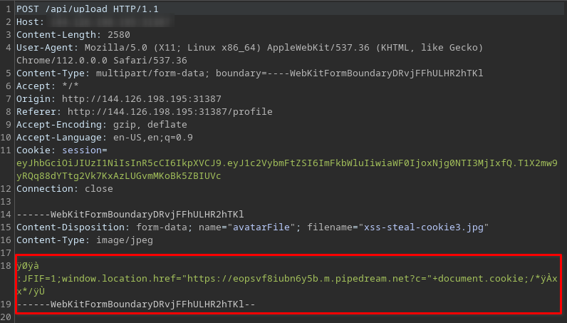 - Inject XSS Payload into the *.jpg file with the script from above to bypass CSP