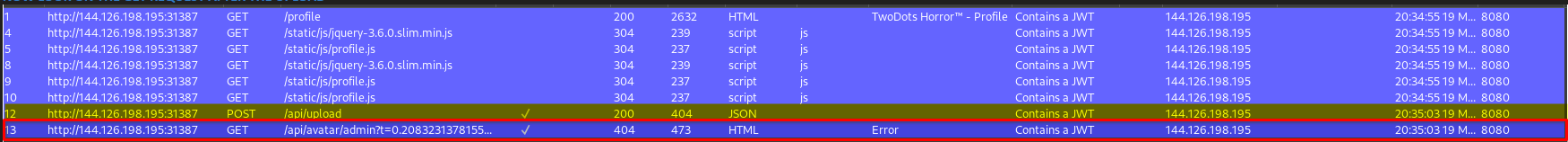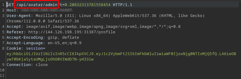 He will get your avatar with the additional XSS payload inside the JPG which steals his cookie and sends it to your webhook.