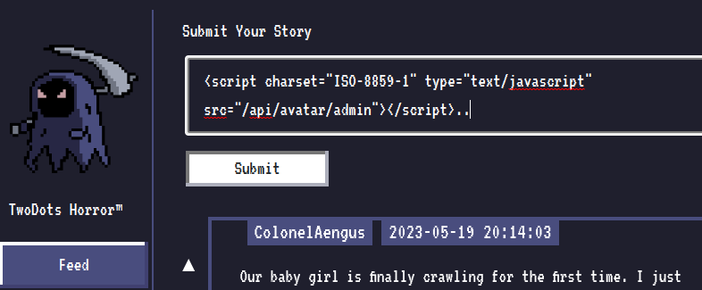 As a user, we can submit stories in the form of text. When we upload a valid story from POST /api/submit it will get reviewed by a bot using purgeData() method. The bot is a headless chromium browser, that visits every post we make, and then deletes db. The bot sets a cookie with a flag we need to obtain.