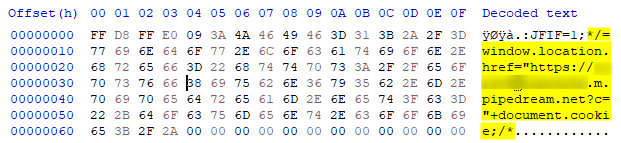 You can see our payload inside the picture with the valid beginning magic bytes. FF D8 FF E0